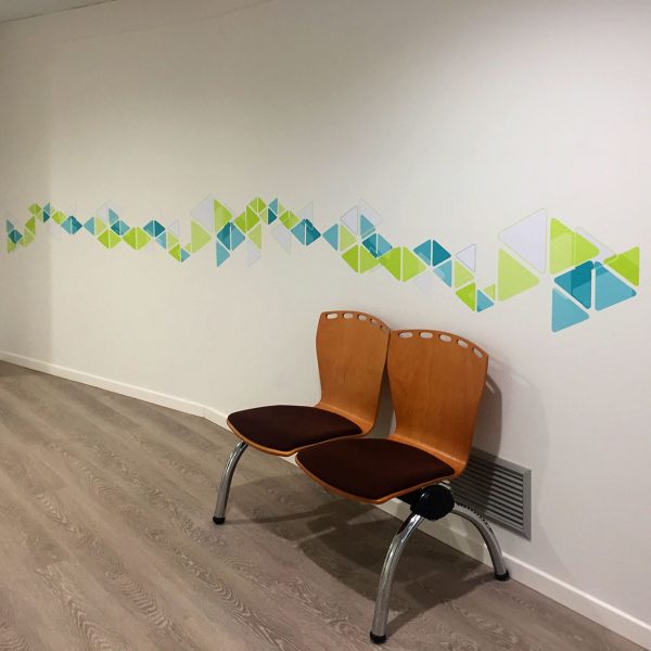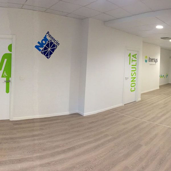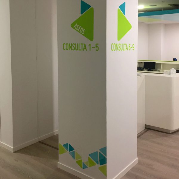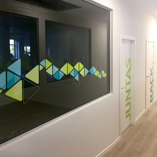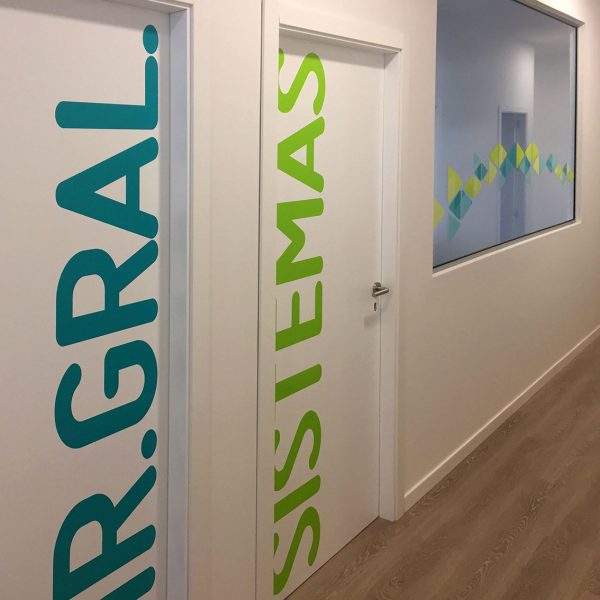 En este caso se realizaron trabajos de colocación de vinilos ácidos en cristaleras, vinilos impresos y recortados a la forma para paredes y columnas, vinilo de corte para directorios de puertas y letras corpóreas para la identificación tanto interior como exterior de las oficinas.