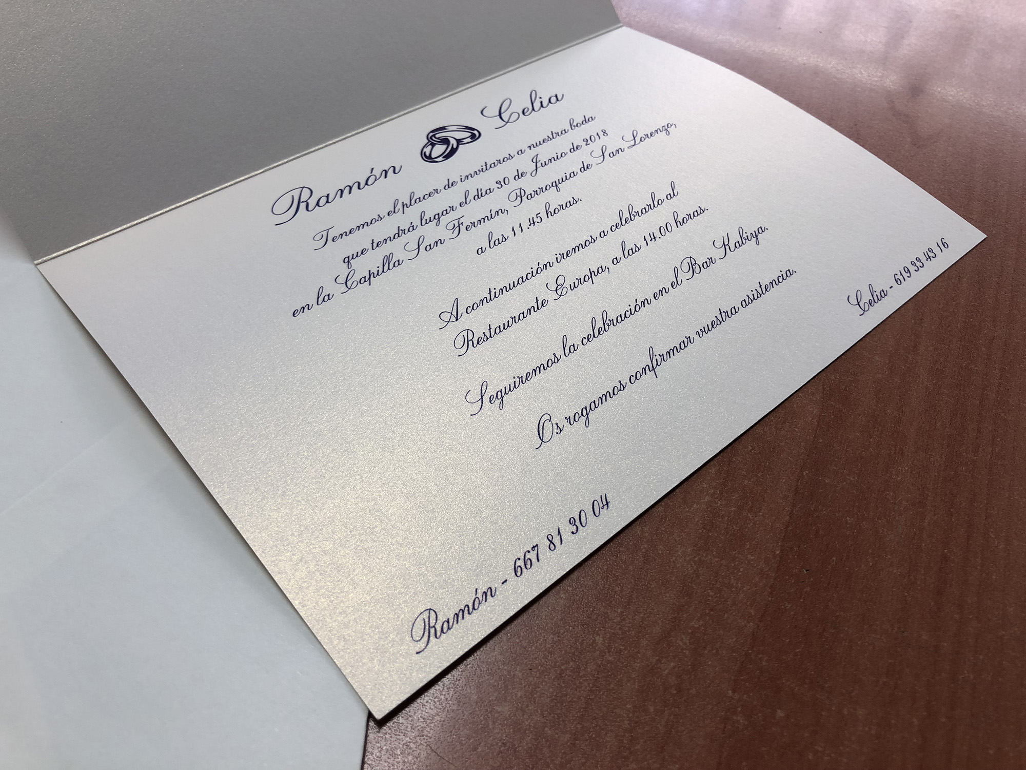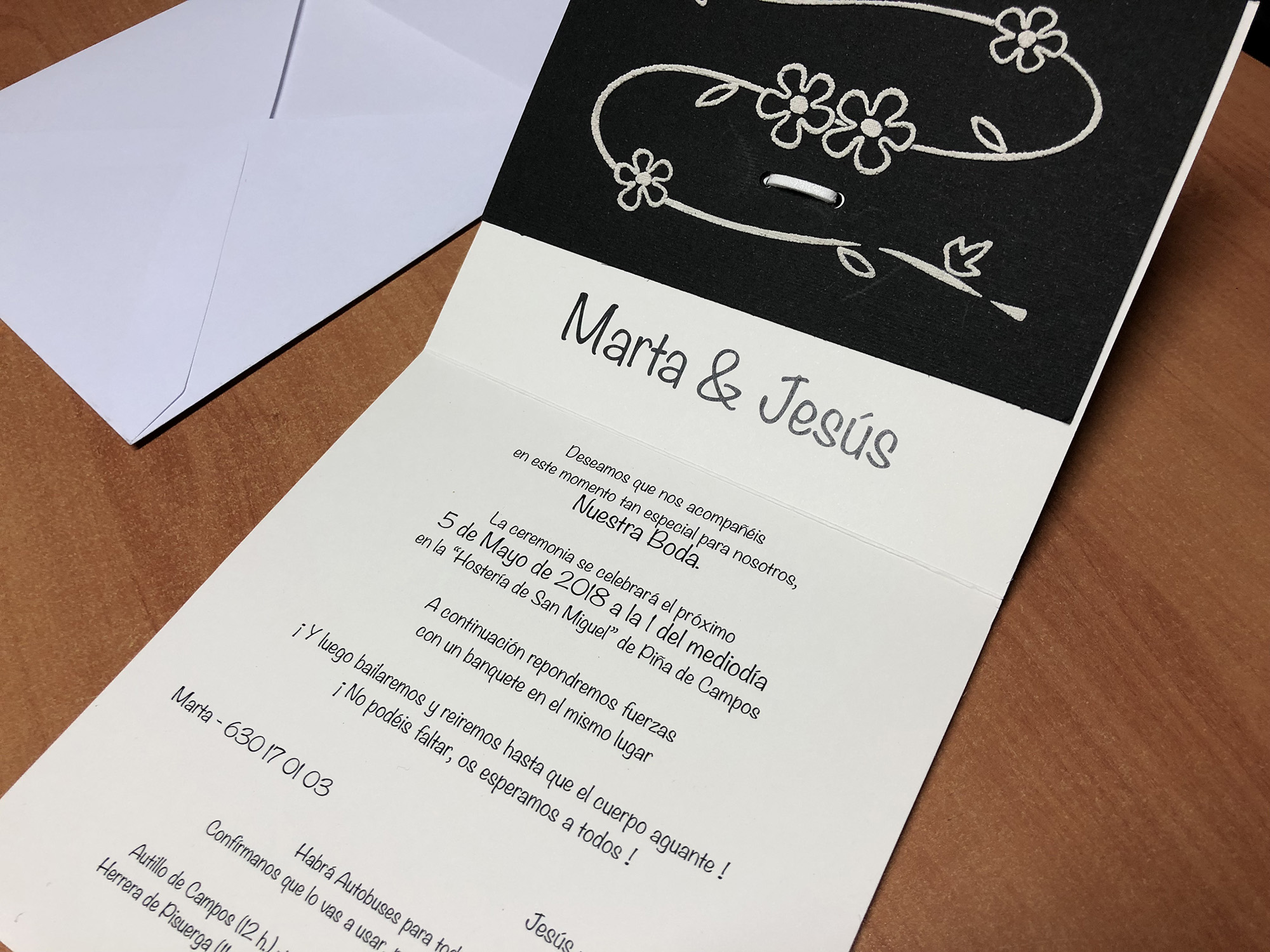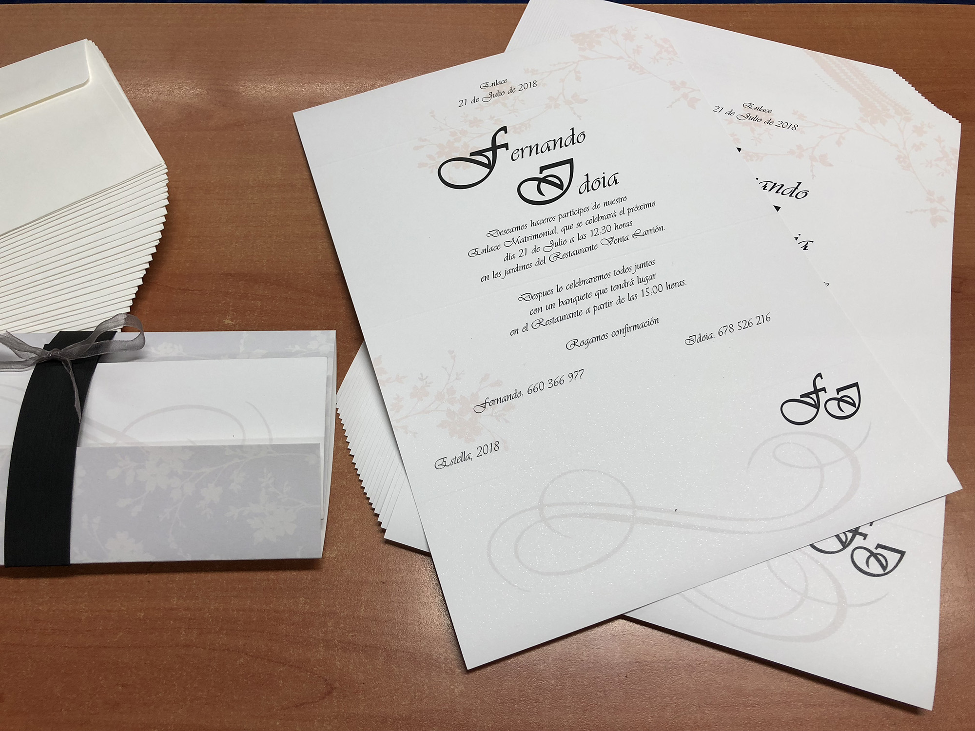 Pero si quieres ser más original, tráenos tu diseño o bien dinos tu idea para que nosotros la diseñemos. Contamos con amplio catalogo de papeles y técnicas de impresión, huecograbado o incluso corte por láser del papel para que sea más sorprendente tu invitación. Acercaros por nuestra tienda y os enseñaremos todas las posibilidades.