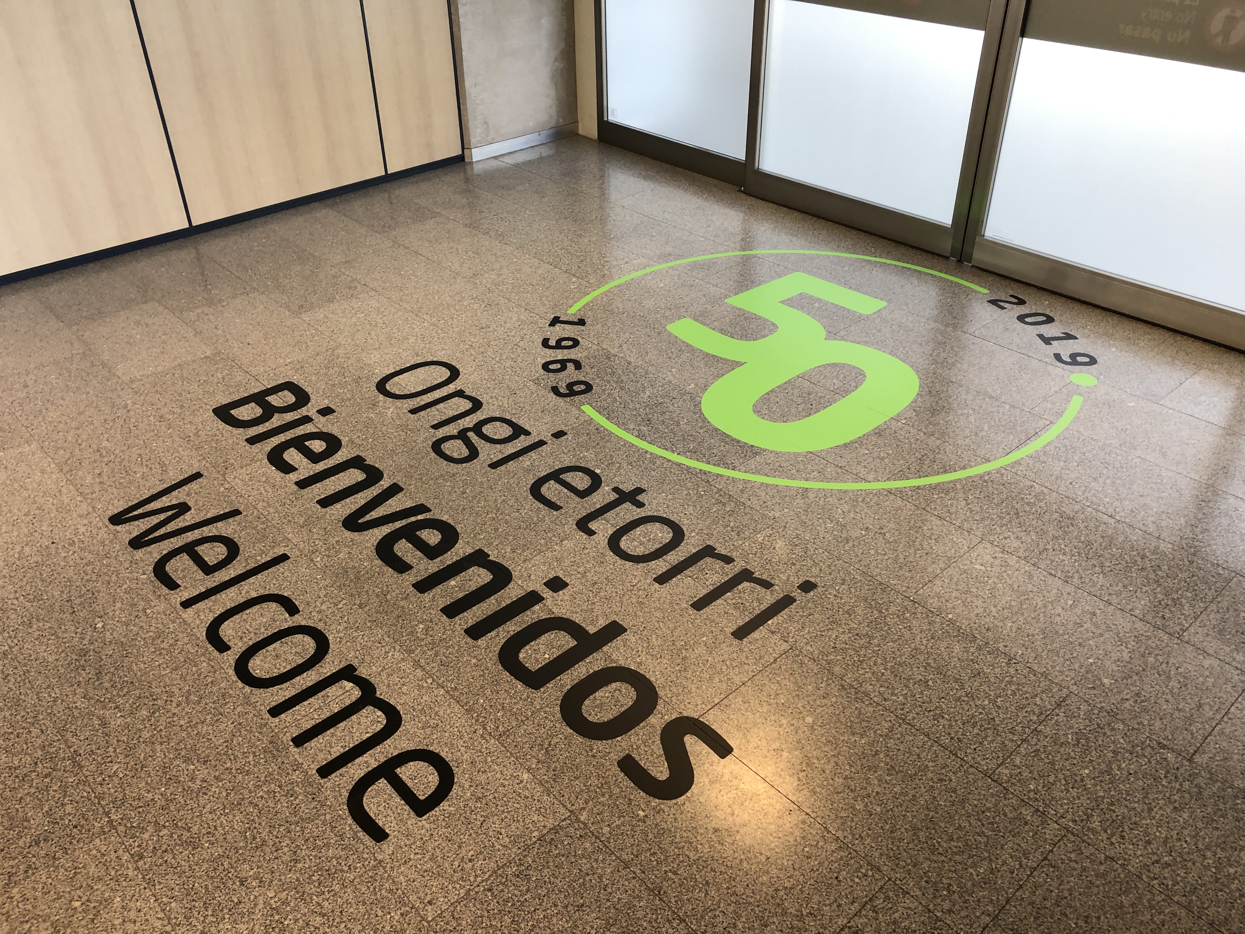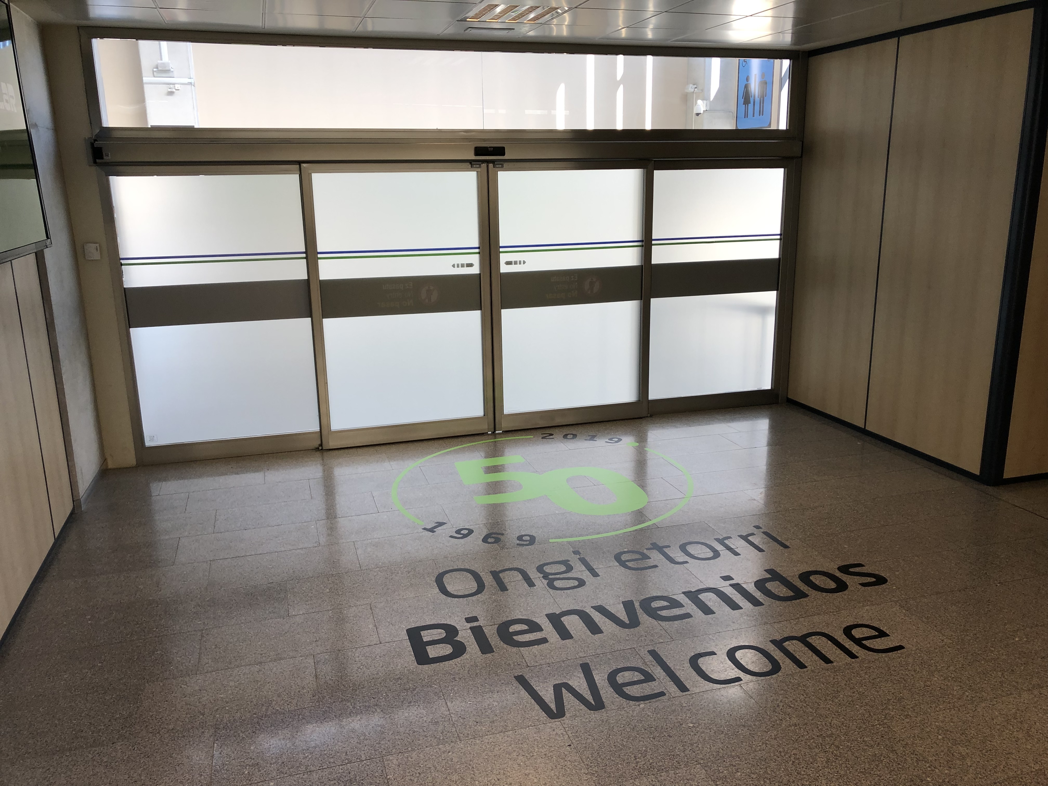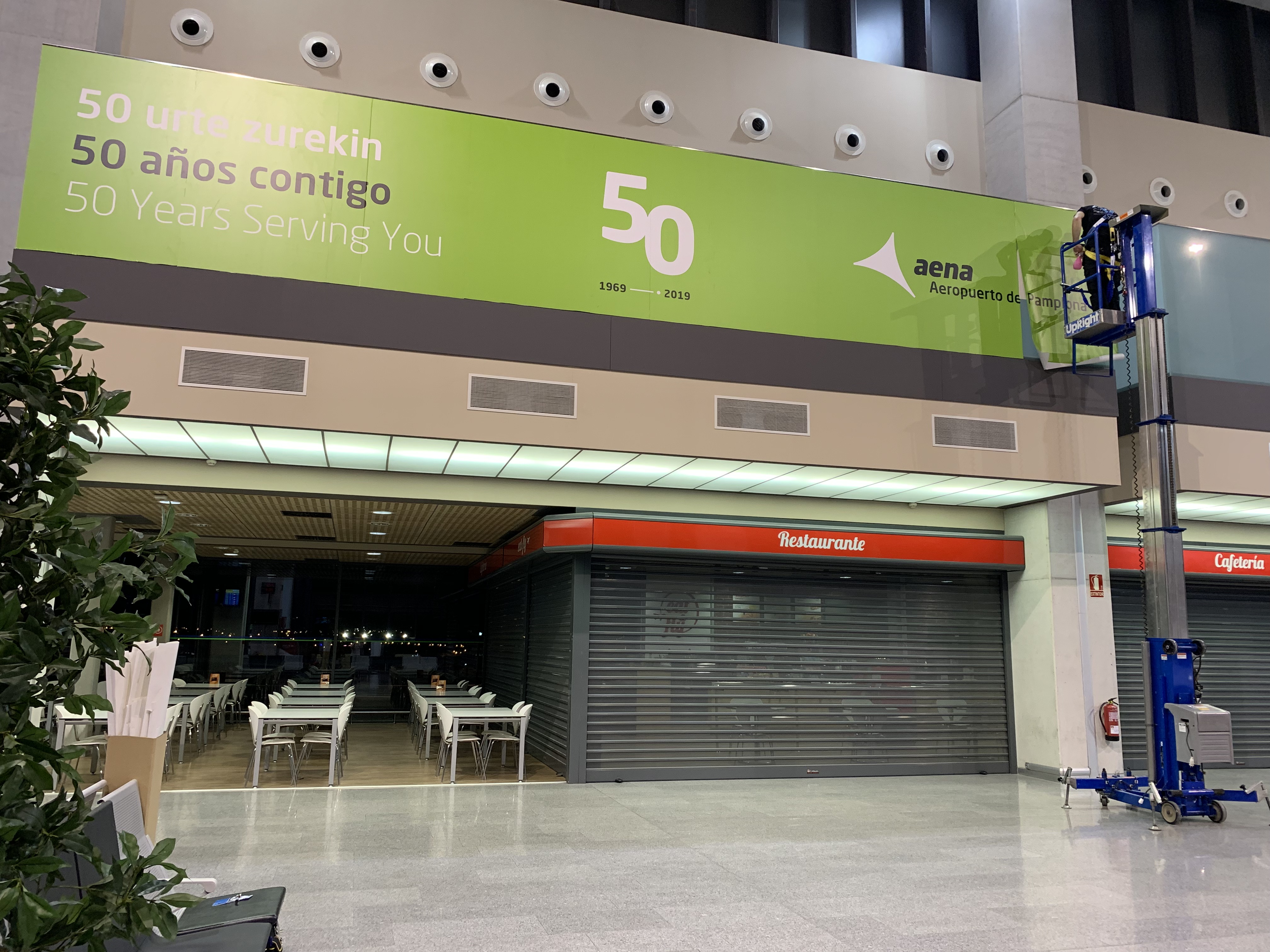 Con el motivo del 50 aniversario del Aeropuerto de Pamplona, nos solicitaron la impresión y colocación de vinilos para conmemorar el aniversario. Han sido dos instalaciones diferentes, uno en suelo y otro en altura.